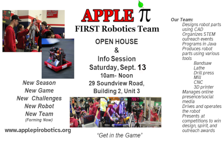 OPEN HOUSE at APPLE PI ROBOTICS, Sept. 9th, 10am-Noon